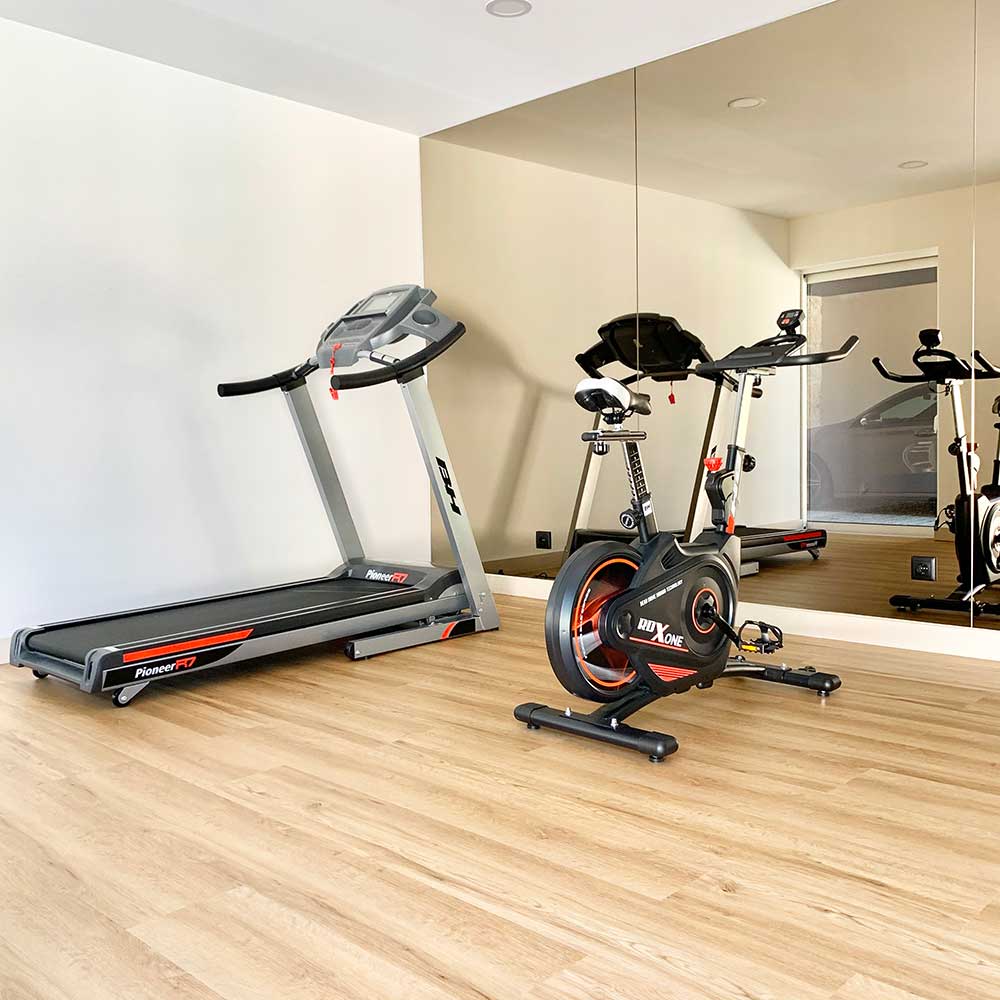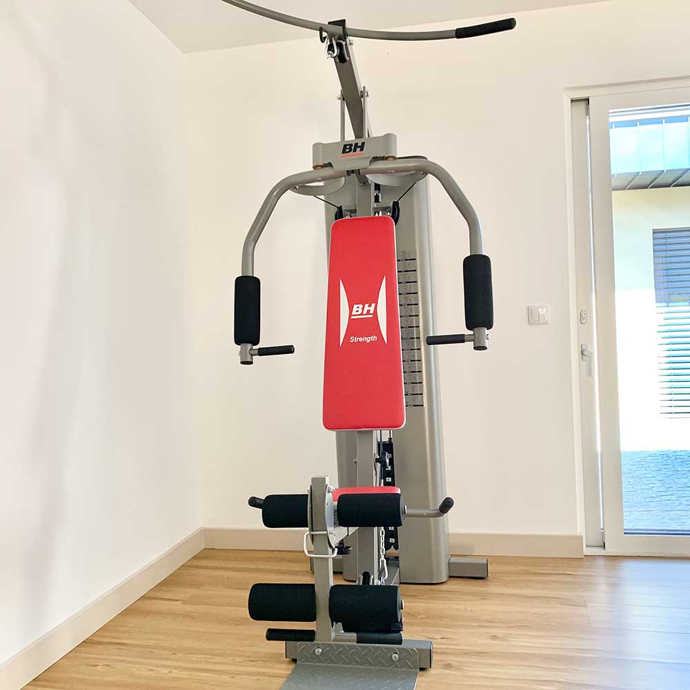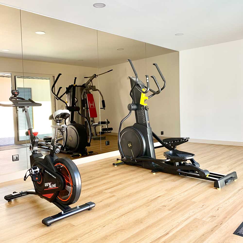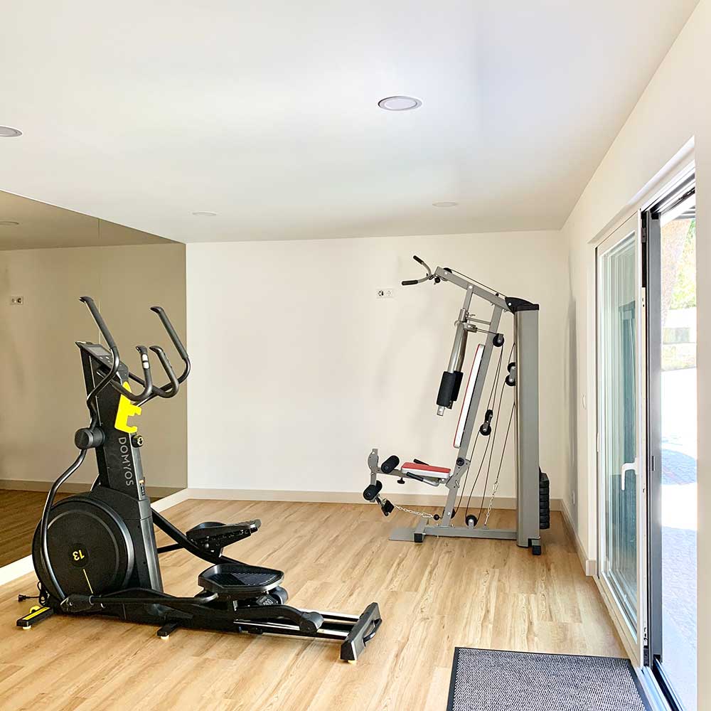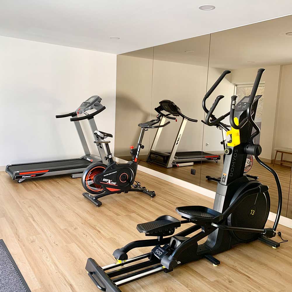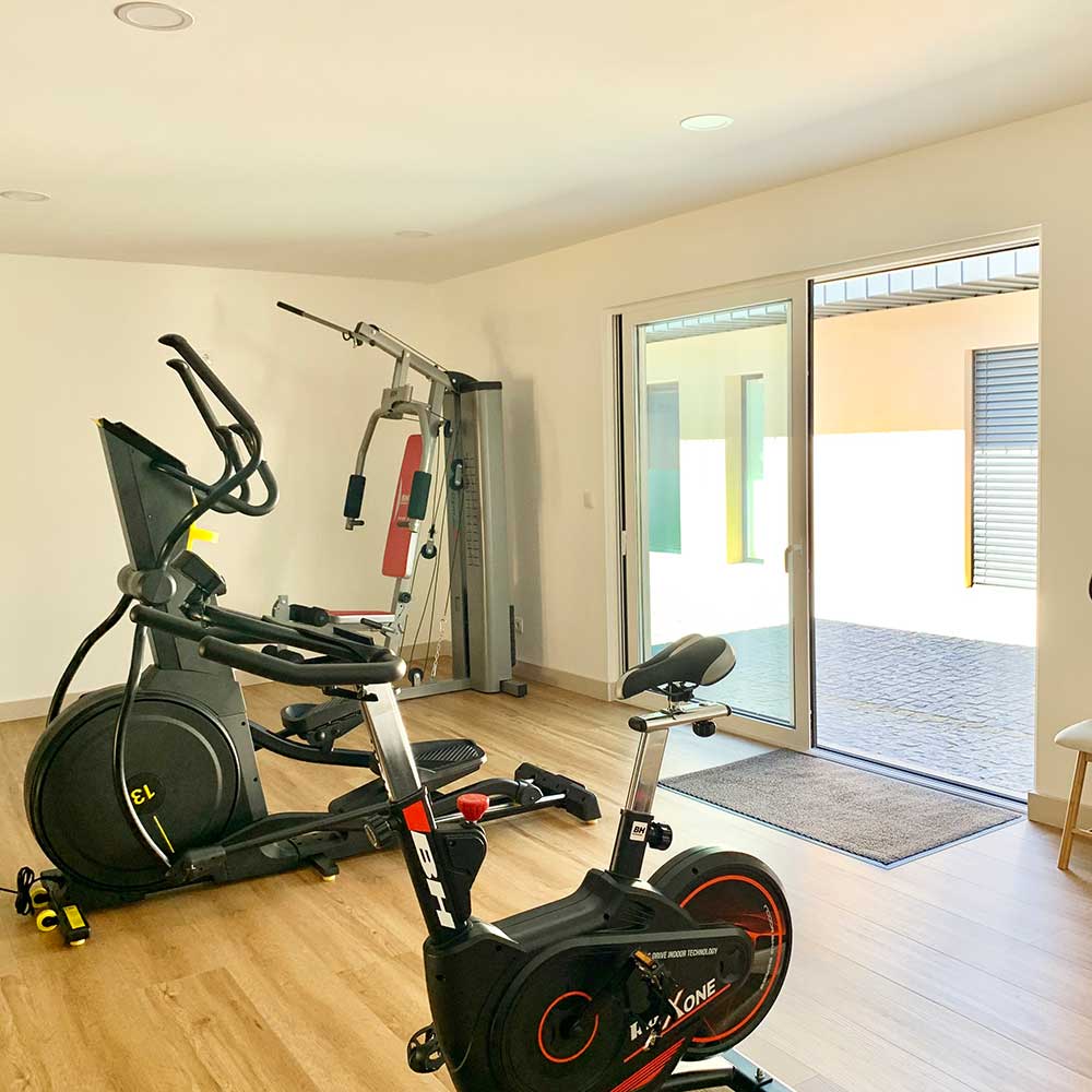 Num espaço amplo, com vista para o jardim e imensa luz natural pode manter a sua rotina de ginásio e desfrutar de todos os equipamentos para a prática de exercício físico.